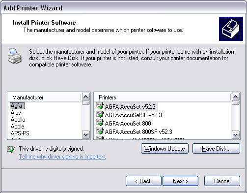 Next, we need to select the driver for our printer. Notice the Have Disk button. You can click this if you need to install the driver from a CD or downloaded driver from the manufacturer.