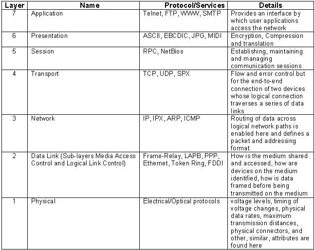 OSI Model (Open Systems Interconnection Model) - Developed by the International Standards Organization (ISO), the OSI reference model is a 7 layer networking framework that divides the networking process into logical layers. The 7 layers are: Physical, Data Link (which has sub-layers called Media Access Control and Logical Link Control), Network, Transport, Session, Presentation, and Application. OSI Model