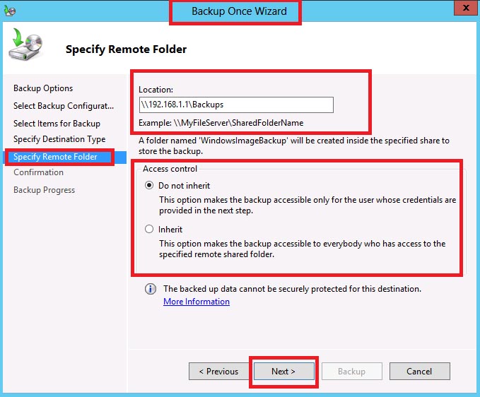 If specifying a remote folder as we did in this example, you will next need to set the access control for the backup files. "Do not inherit" makes the files only available to the user with write permissions that is specified in the next step. Selecting "Inherit" causes the backup files to inherit the permissions of the shared folder. Anyone who can access the folder, can access the backup file(s).